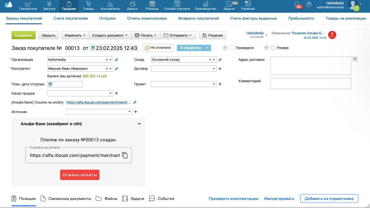 3) Создание платежа (функционал позволяет создать ссылку на оплату заказа);