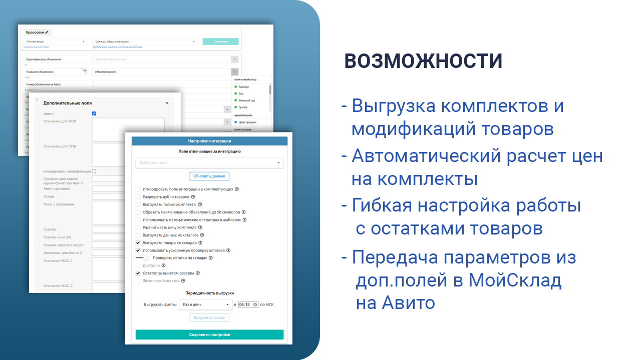 Автовыгрузка товаров, передача остатков. Синхронизация заказов. Чаты. До 50 аккаунтов. Бесплатная настройка. Поддержка работы с комплектами и модификациями.