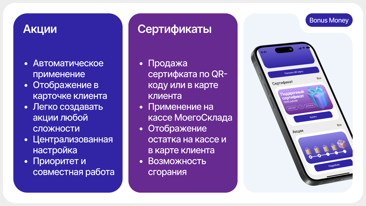 • Используйте сертификаты, промокоды и сложные акции там, где раньше их не было — в розничных продажах на кассе МоегоСклада
