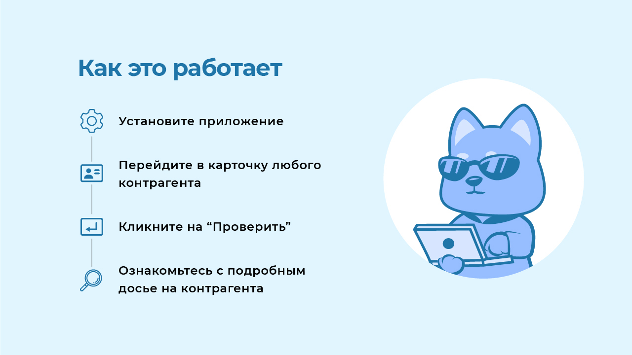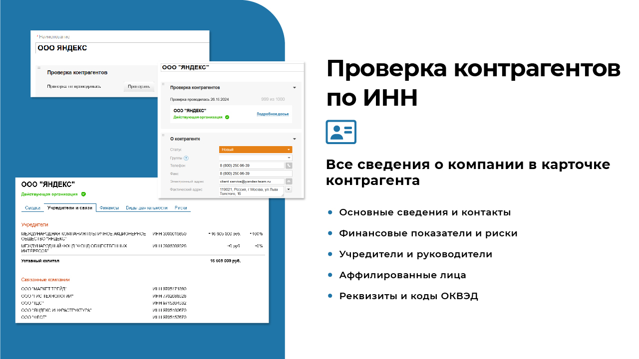 Приложение минимизирует риски при работе с контрагентами и оптимизирует бизнес-процессы. Детальная информация о компании доступна прямо в карточке контрагента. Не нужно тратить время на поиск информации в интернете.
