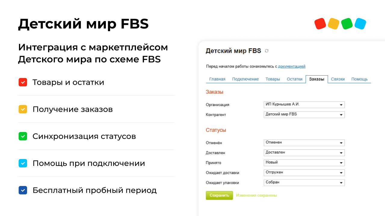 Маркетплейс Детского мира — МойСклад — FBS. Товары, остатки, заказы, статусы. Загружаем новые заказы из Детского мира, выгружаем остатки из МоегоСклада. Автоматически передаем статусы заказов из Детского мира в МойСклад.