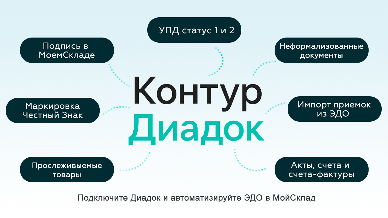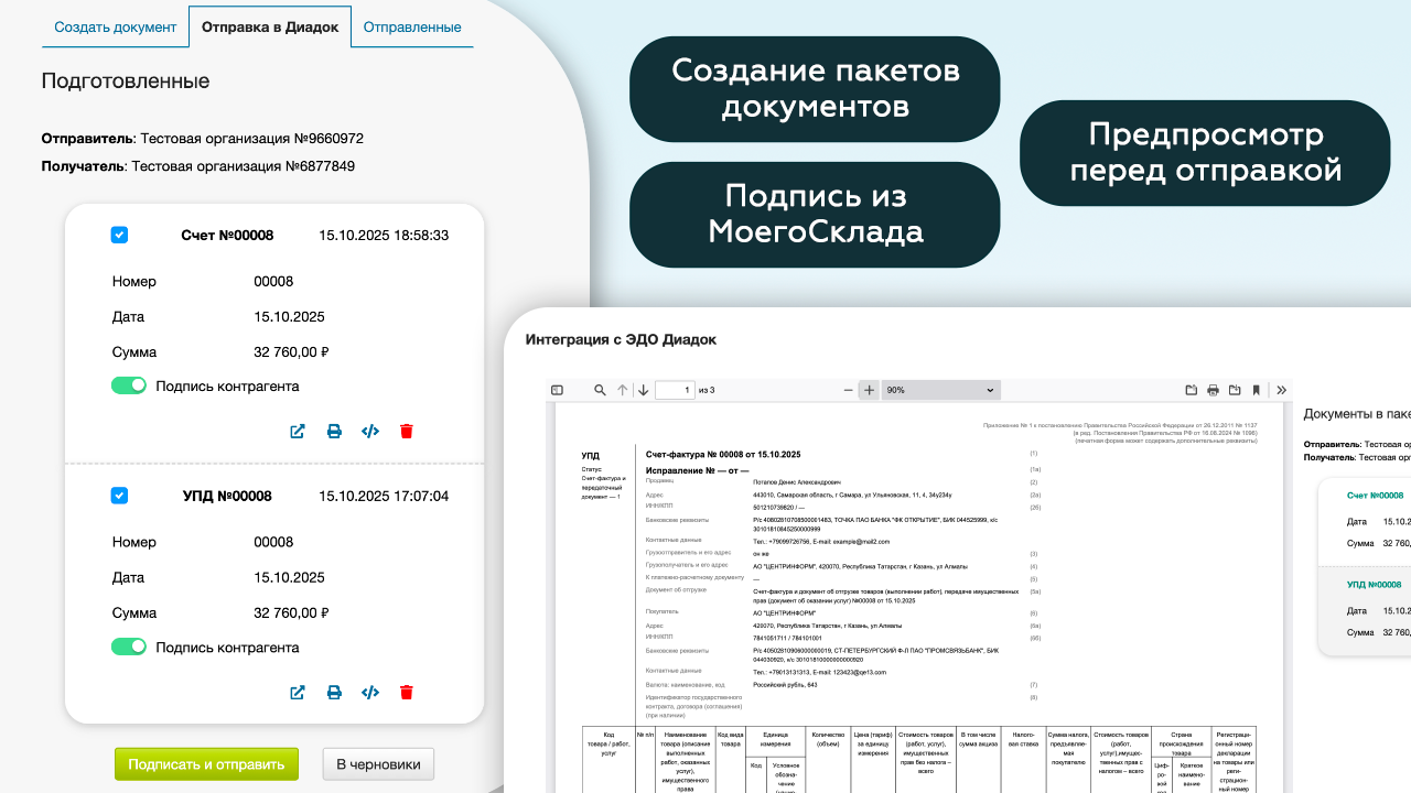 • Гибкие сценарии отправки — подпишите и отправьте документ прямо из МойСклад или сохраните его в черновиках Диадок