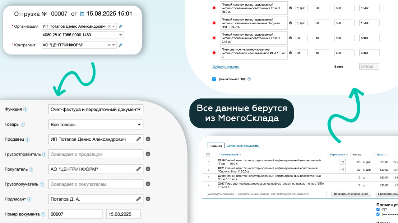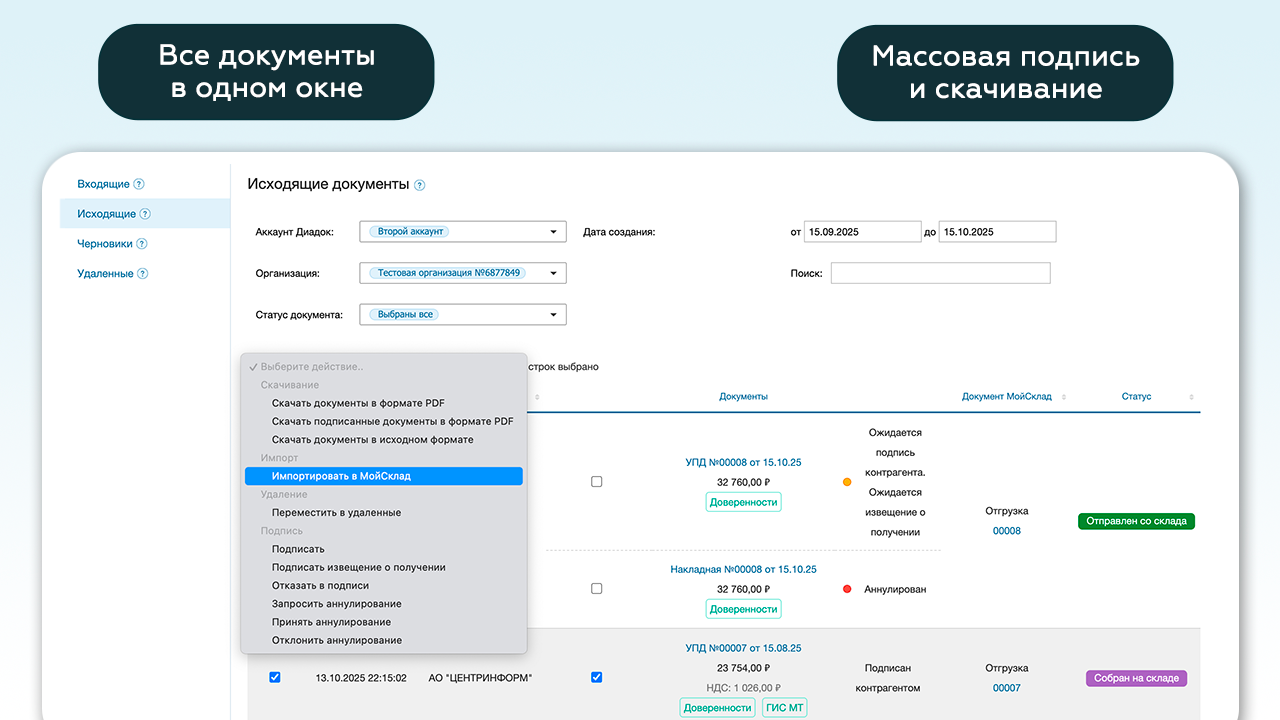 Создавайте, подписывайте и отправляйте УПД (статус 1 и статус 2), счета, акты, счета-фактуры и неформализованные документы (DOC, PDF, XLS и другие) прямо из МоегоСклада в режиме «одного окна».