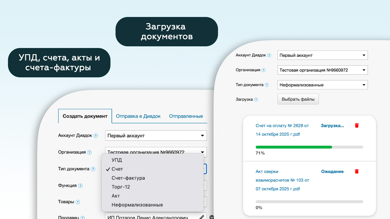 • Работа с любыми документами: УПД (статус 1 и статус 2), счет, счет-оферта, счет-фактура, акт, ТОРГ-12, неформализованные файлы (DOC, PDF, XLS и др.)