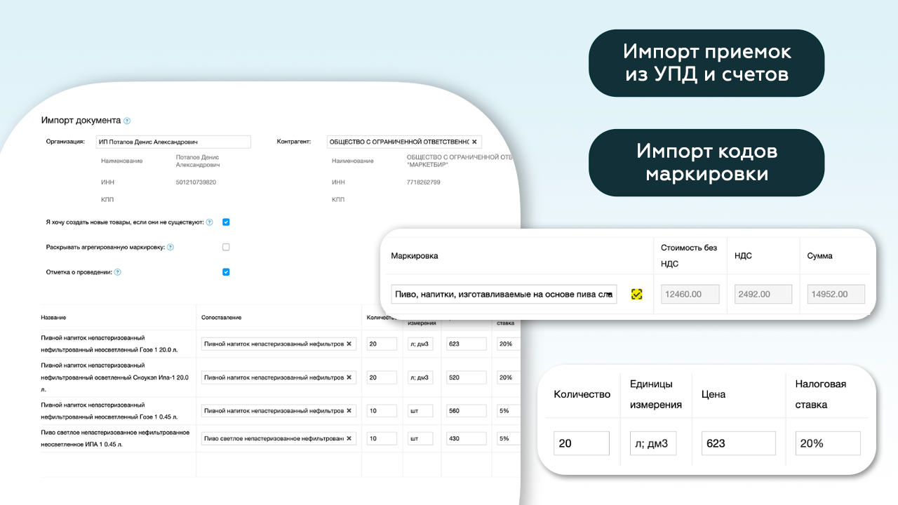 • Импорт приемок по УПД и счетам — решение автоматически сопоставит товары или создаст их при необходимости