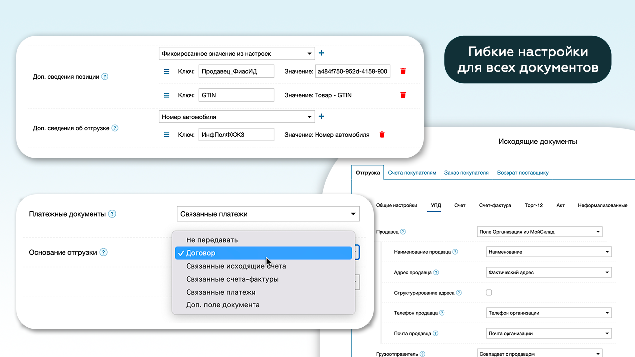 • Удобный виджет в интерфейсе МоегоСклада: выбор организации, контрагента и типа документа — минимум действий, максимум контроля