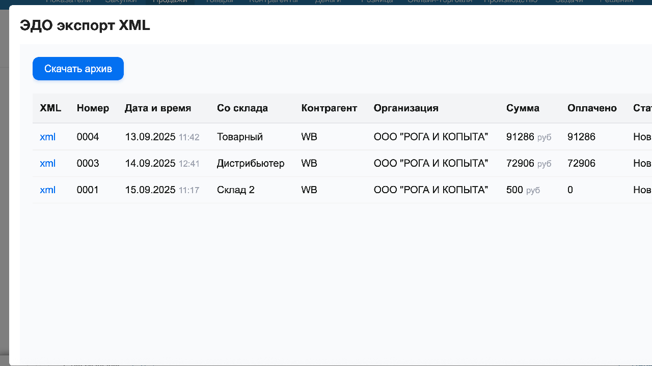 Процесс работы интуитивно понятен. Вам необходимо в интерфейсе МойСклад выбрать нужные отгрузки, нажать на кнопку «Решения» → «Экспортировать XML 5.03», и решение автоматически сформирует для каждой отгрузки соответствующий XML файл. Все файлы будут упакованы в удобный архив, который вы сможете скачать одним кликом.