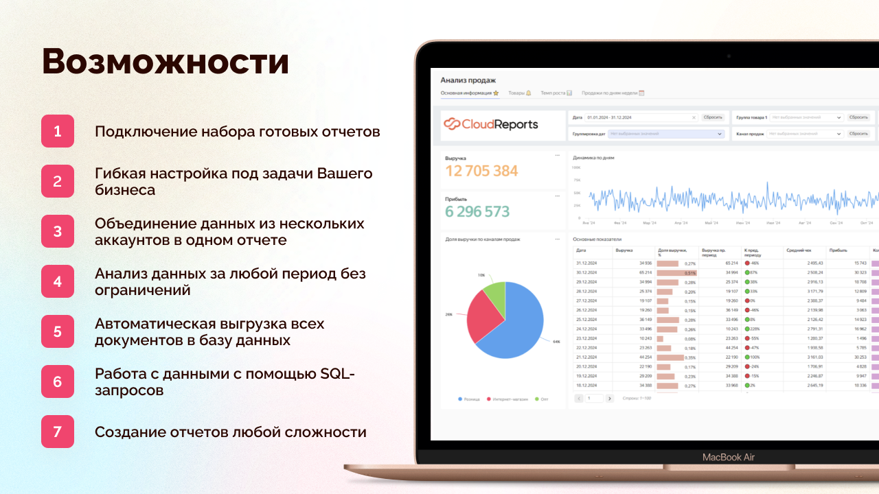 CloudReports - платформа для простой разработки аналитики для облачных сервисов: МойСклад, RetailCRM, amoCRM, Wildberries и других.
