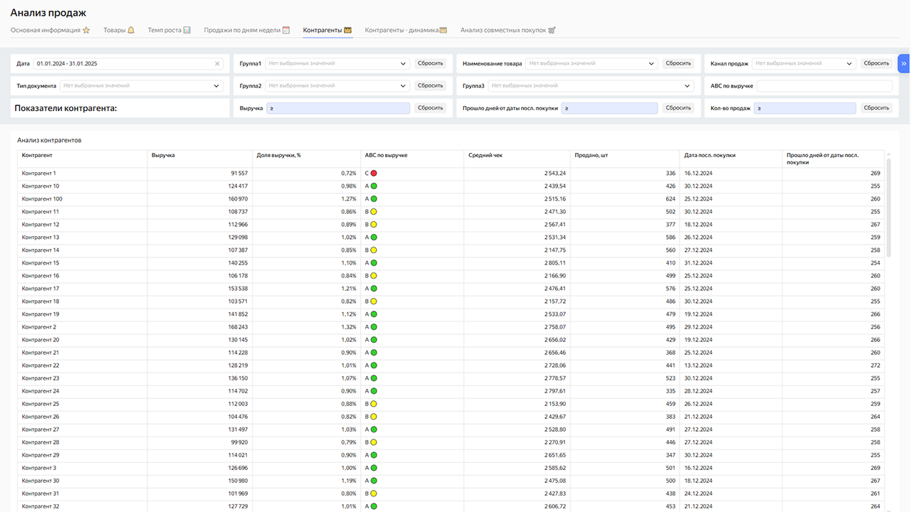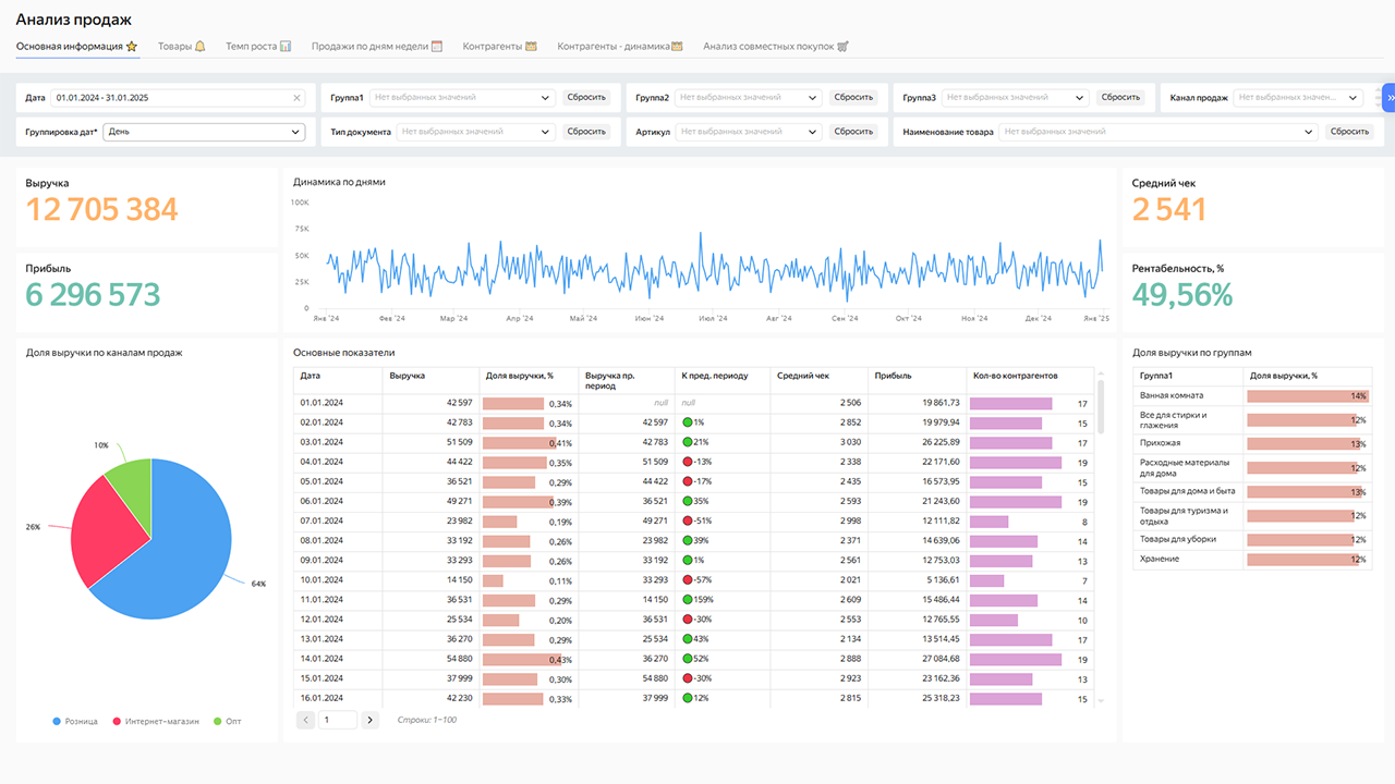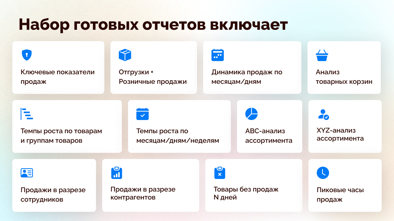 - Готовые шаблоны отчетов: продажи, анализ контрагентов и ассортимента, динамика, темпы роста и другие