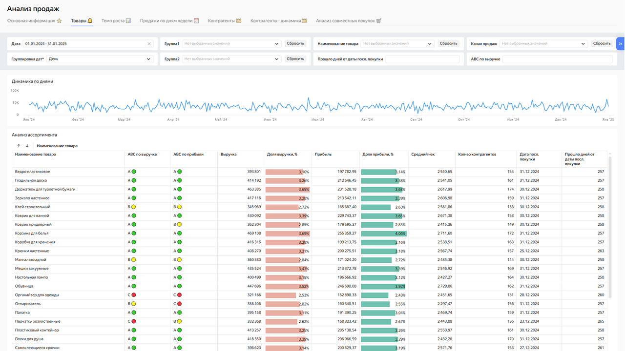 - Анализ ассортимента: оборачиваемость, упущенная выручка, динамика остатков и контроль наличия товара за период