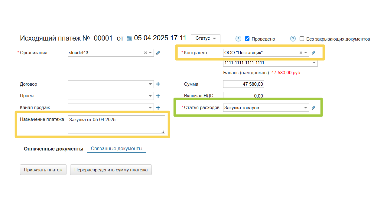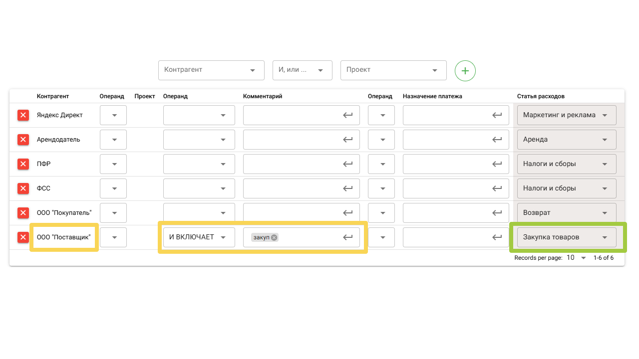 Программа ставит статью расходов в платежах по вашим правилам. Правила могут учитывать: Контрагента, Проект, Назначение платежа и Комментарий. Срабатывает при создании платежа.