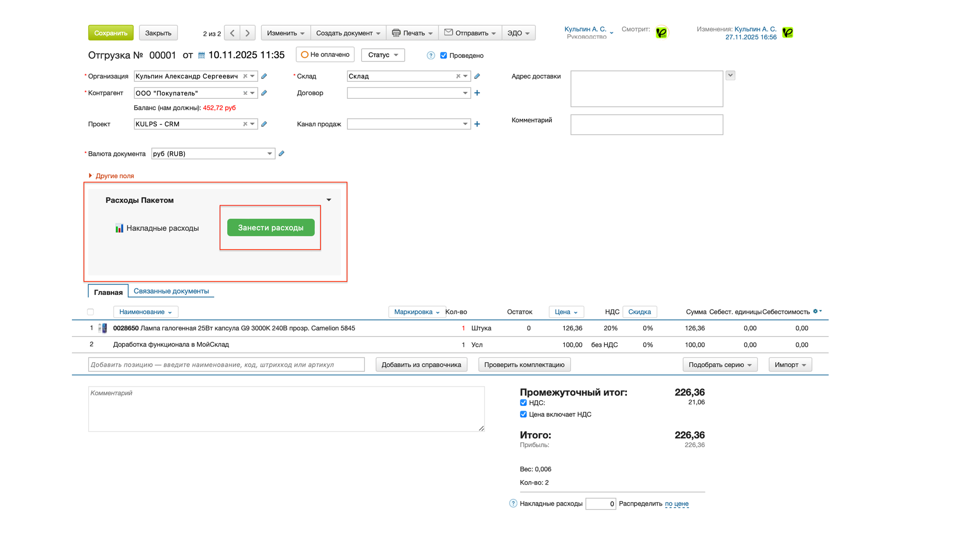 - Система автоматически найдет все указанные отгрузки и добавит в них соответствующие суммы накладных расходов.