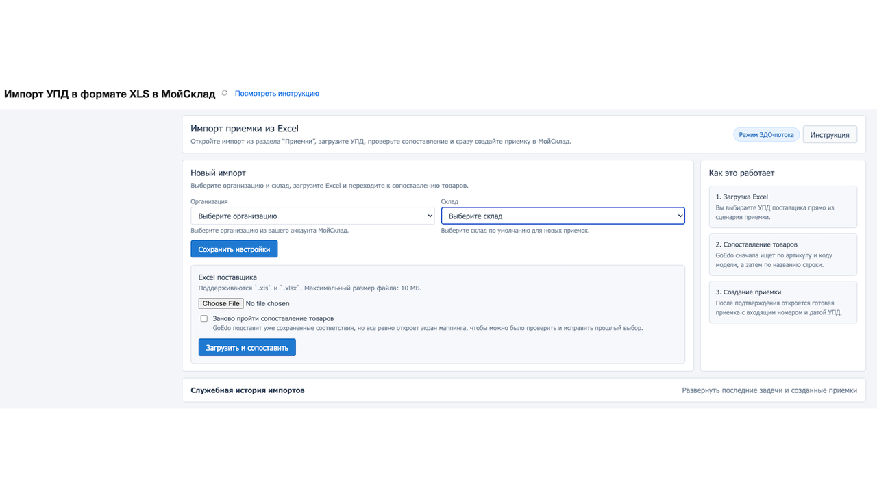 GoEdo позволяет импортировать УПД от поставщиков в Excel-форматах в МойСклад. Пользователь загружает .xls или .xlsx с УПД, сервис распознает документ, извлекает позиции и формирует готовые приёмки в МойСклад.