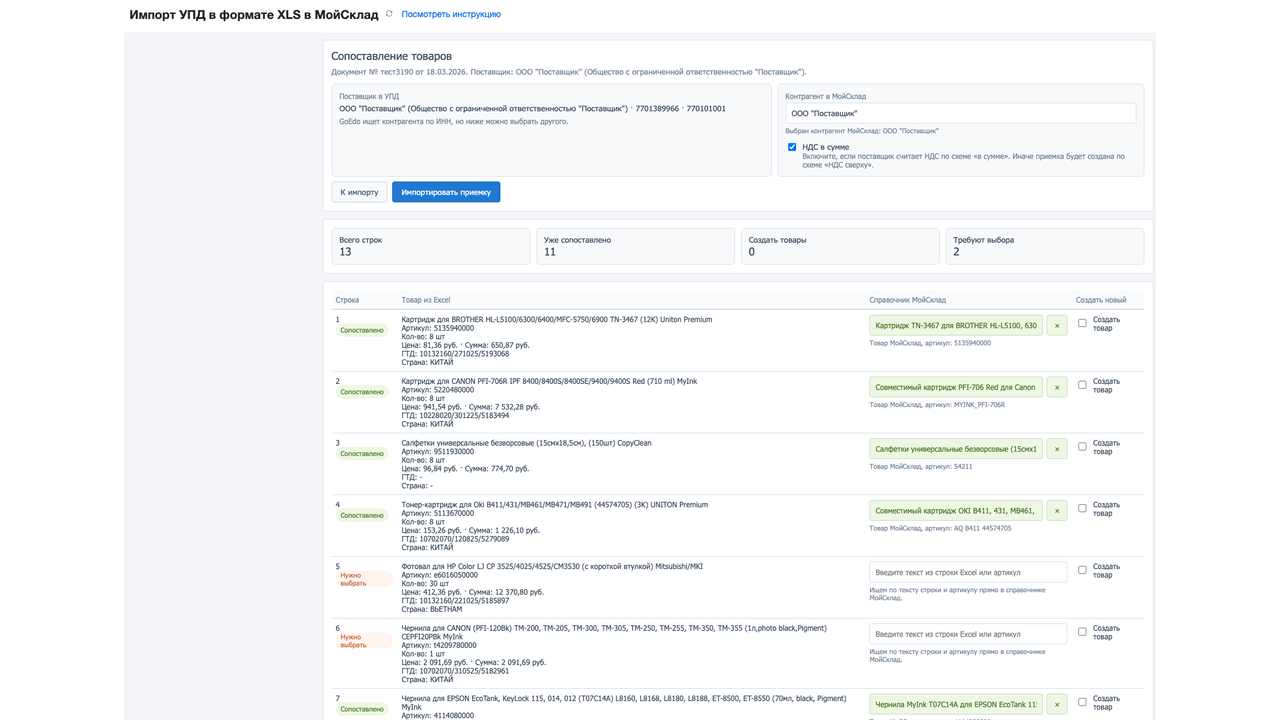 Сопоставьте товары в УПД поставщика с товарами в Вашем каталоге.