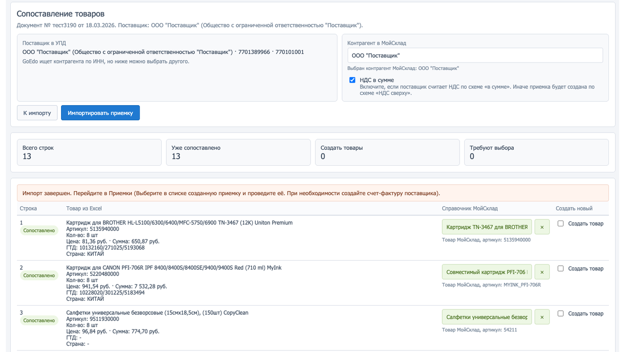 Сейчас решение работает по сценарию "загрузить Excel -> сопоставить товары -> импортировать приемку в МойСклад". Это первый этап интеграции. В следующих версиях планируется более глубокая работа через API МойСклад.