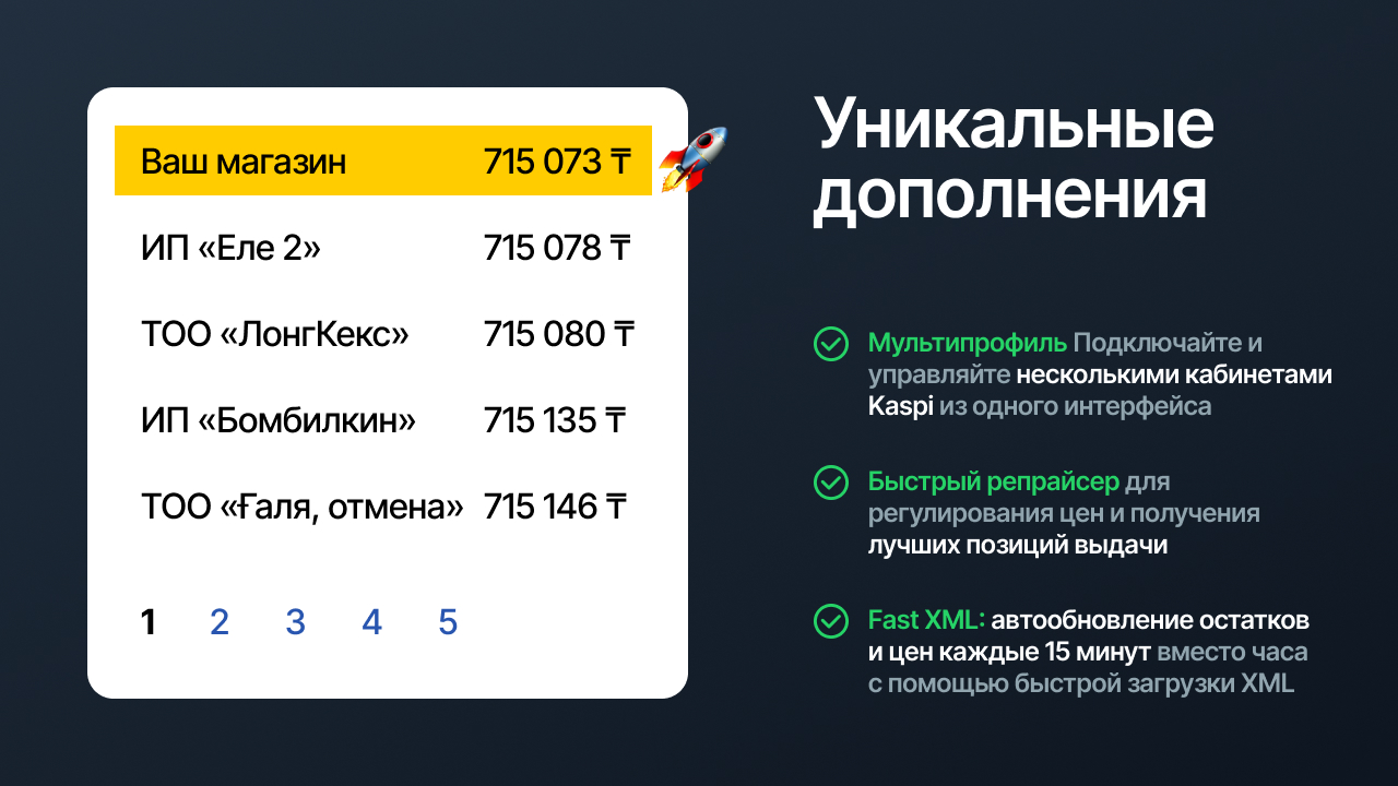 - Мультипрофиль: Подключайте и управляйте несколькими кабинетами Kaspi из одного интерфейса.