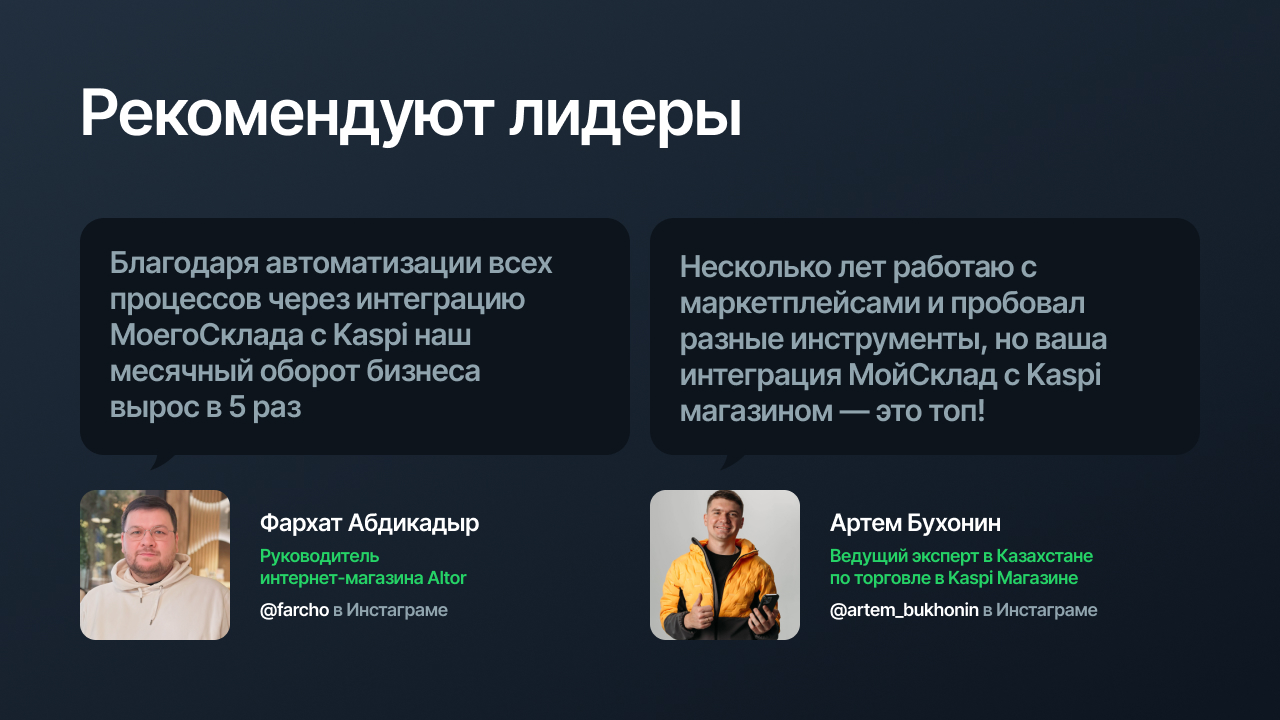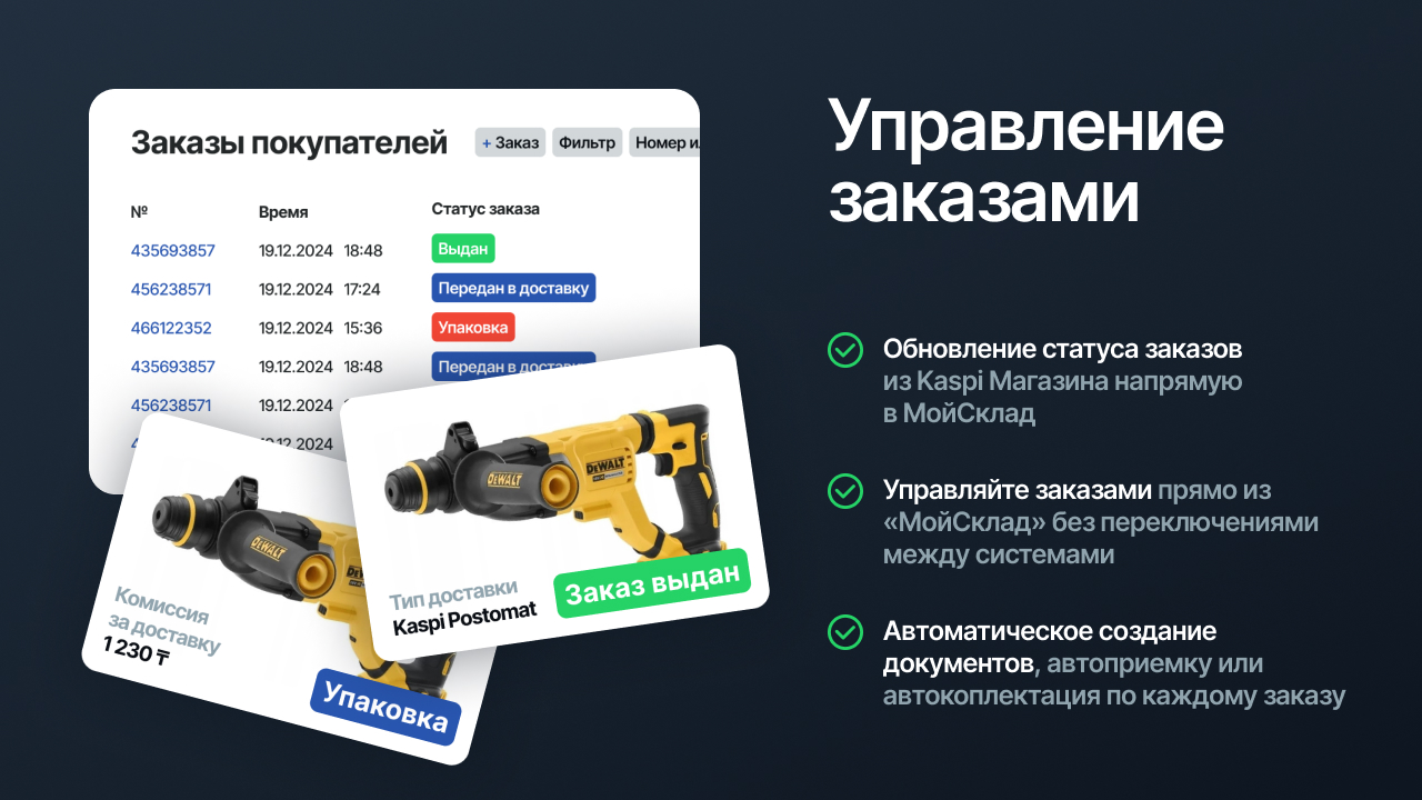 - Актуальные статусы: Получайте обновления статусов заказов из Kaspi напрямую в МойСклад.