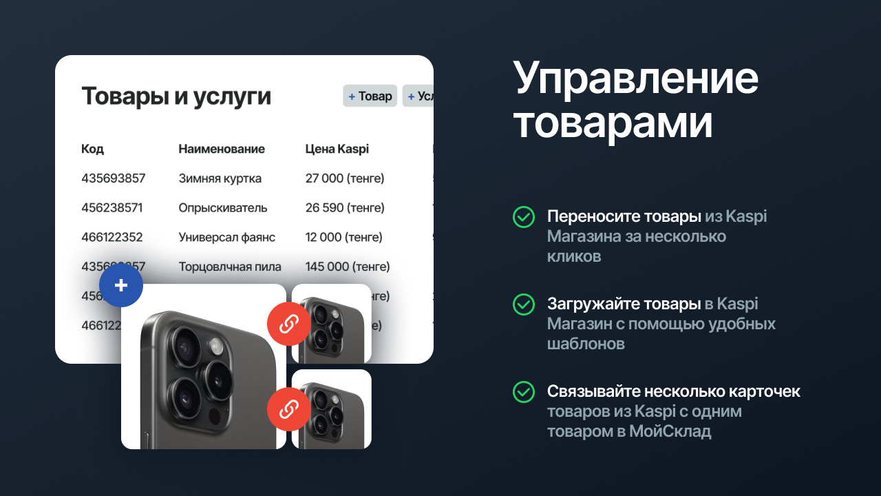 - Привязка карточек: Связывайте несколько карточек товаров из Kaspi с одним товаром в МойСклад.