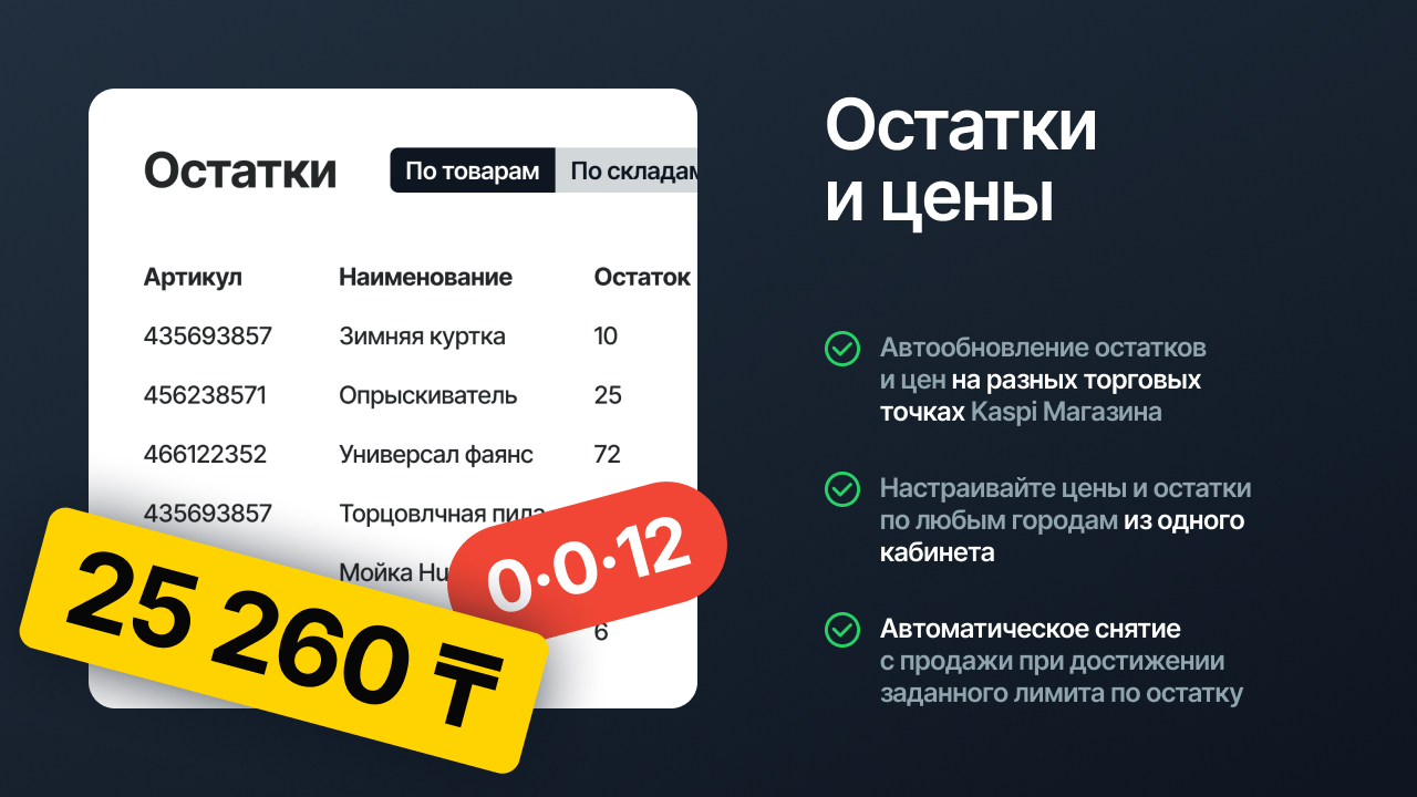 - Синхронизация остатков и цен: Автоматически обновляйте остатки и цены на торговых точках Kaspi.