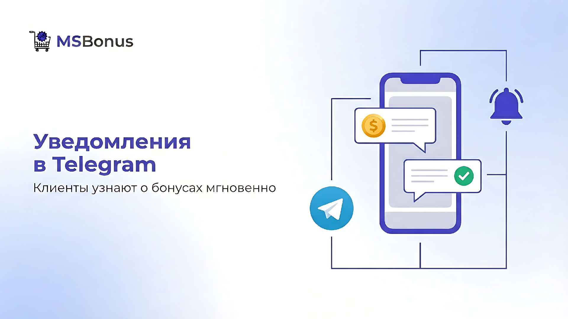 Telegram-бот MSBonus — клиенты подписываются через бота и получают уведомления. Бот предоставляет Mini App: баланс, история операций, уровень лояльности прямо в Telegram. Ссылку и QR-код можно скачать из настроек, доступен от Базовой подписки.