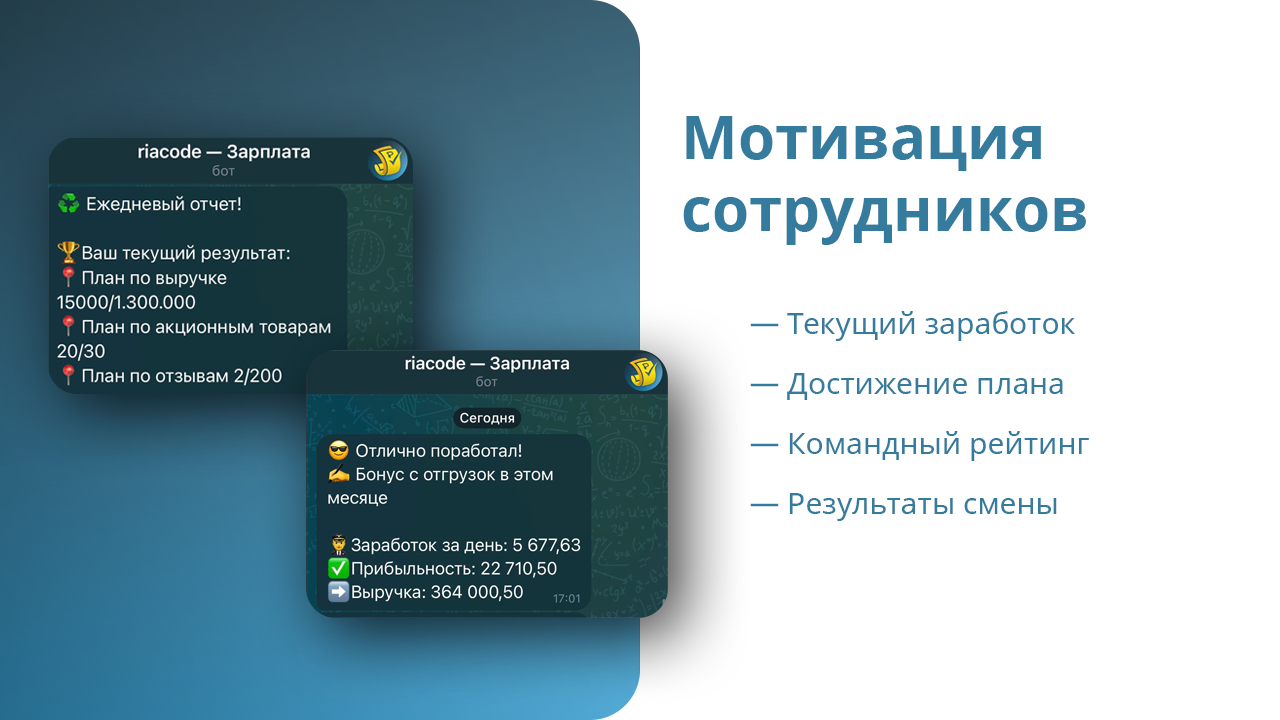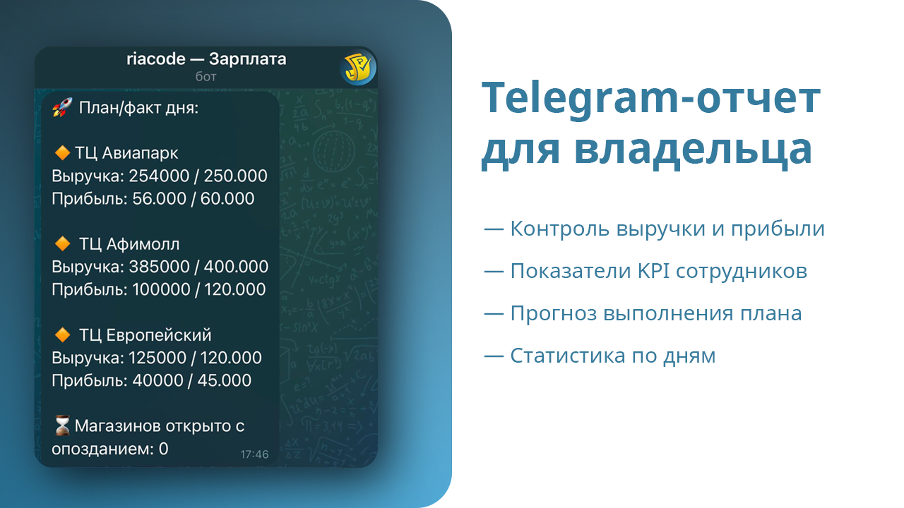 Руководители и владельцы бизнеса в нашем приложении настраивают ежедневные/еженедельные отчёты в Telegram по ключевым показателям бизнеса, таким как выручка, прибыль, количество продаж маржинальных продуктов, анализ проработки ключевых клиентов.