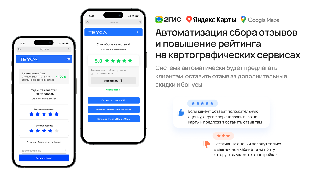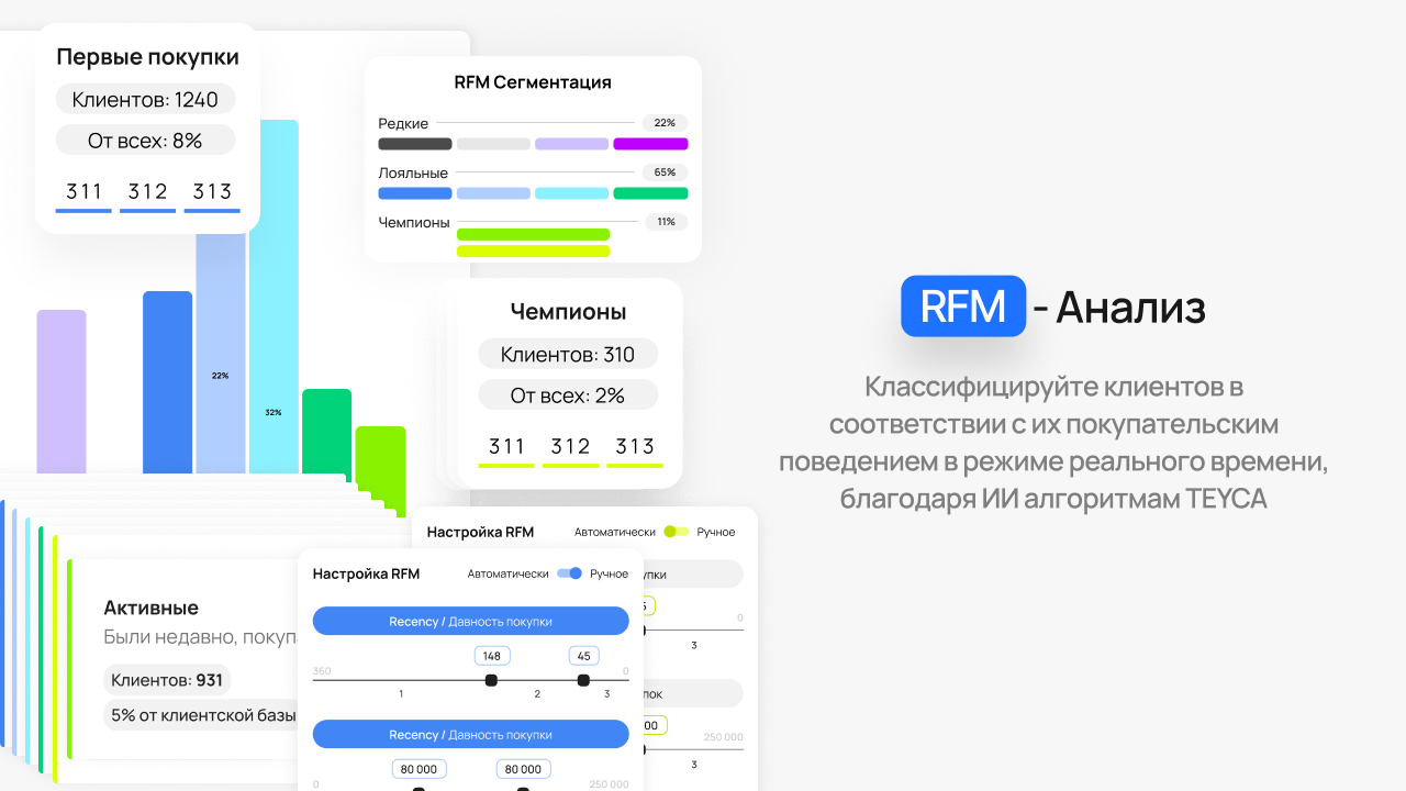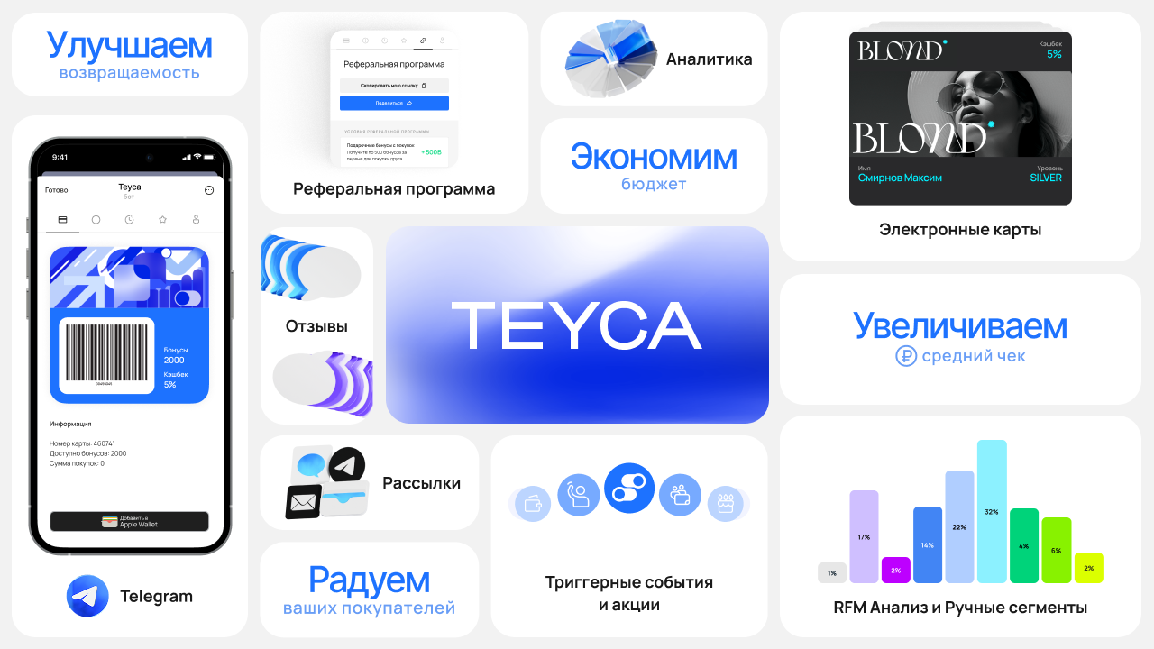 TEYCA – это совокупность маркетинговых инструментов для повышения лояльности клиентов и роста повторных продаж. Сервис предназначен для запуска программы лояльности и объединяет всё необходимое для работы с клиентской базой и автоматизации маркетинга.