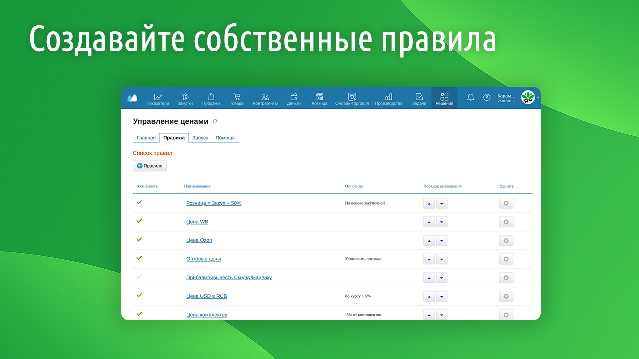 Формировать и поддерживать цену комплектов на основе входящих в состав компонентов. - Ручной или автоматический запуск правил.
