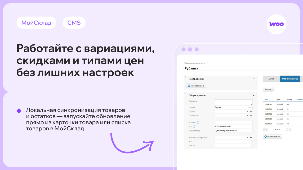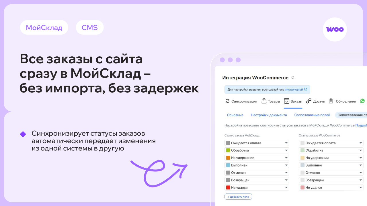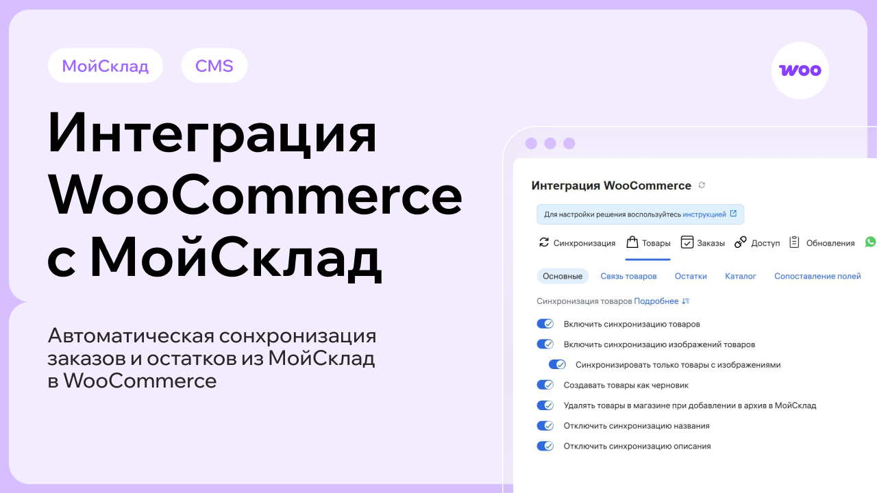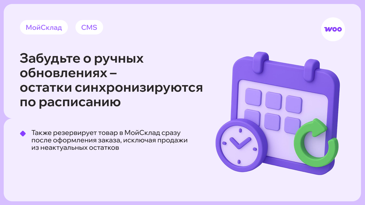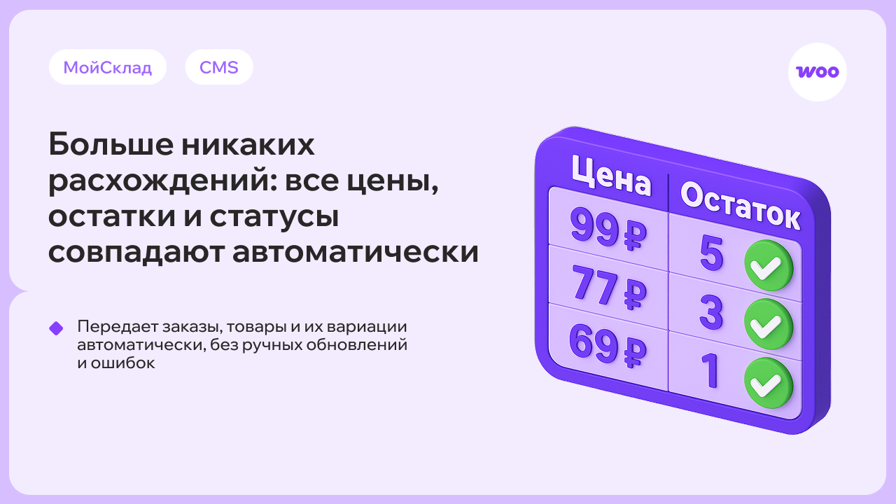 Всё обновляется автоматически: новые заказы из WooCommerce появляются в МойСклад, изменения на складе — на сайте.