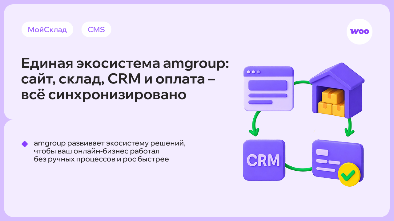 Интеграция WooCommerce с МойСклад от amgroup — это единая экосистема для автоматизации онлайн-продаж.