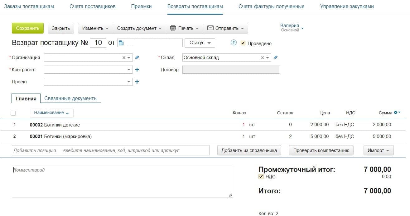 Оформить возврат товара поставщику в МоемСкладе можно на основании документа приемки.