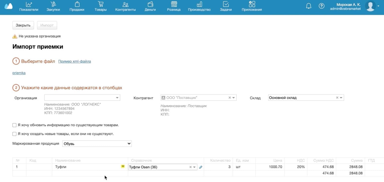 Документы приемки также можно импортировать из систем электронного документооборота в формате XML или напрямую с помощью интеграций Такском, 1С: Клиент ЭДО, ЭДО Лайт.