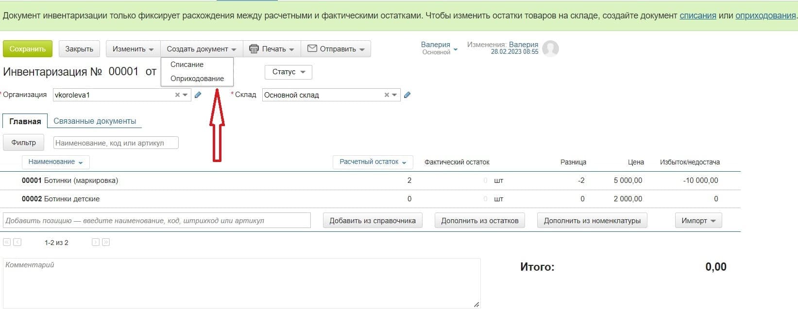 Расхождения между количеством по документам и по факту определяет сама программа. Подгрузите текущие остатки, внесите фактические — корректирующие документы будут созданы автоматически.