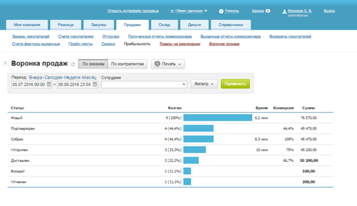 Сервис позволяет наладить учет продажи товаров в торговле, заниматься закупками, работать с клиентской базой, а также эффективно управлять отделом продаж.
